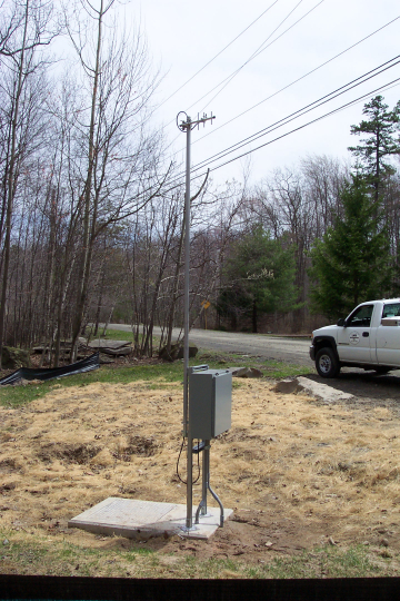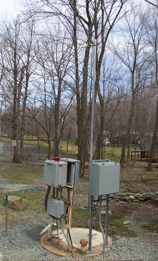 Welcome to Lake Adventure, a nice, quiet community in Pennsylvania. The sewage system for this area is composed of 4 pump stations that pump sewage water to the water treatment station. Communication between the treatment station and water pumps is handled wirelessly. We have a host radio (H) at our treatment center that is unable to directly communicate with surrounding pump stations due to the many elevation fluctuations of the terrain. To overcome this problem, we have set-up a repeater remote (R) in a central location to communicate with radios located in outlying pump stations. The repeater is assembled on a relatively high ground of the terrain in order to maximize its range. The repeater remote has been attached to a telephone pole in order to give it even greater range (see picture of repeater below). This repeater is responsible for communicating with pump stations 2, 3, and 4, which are located around the Lake Adventure Facility. The radio at pump station 4 acts as a relay for pump station 1, because the radio at this station can’t communicate directly with the repeater due to the terrain and remote location of the site Refer to the aerial picture above of Lake Adventure to get an overview of the host, repeater, and pump station locations.