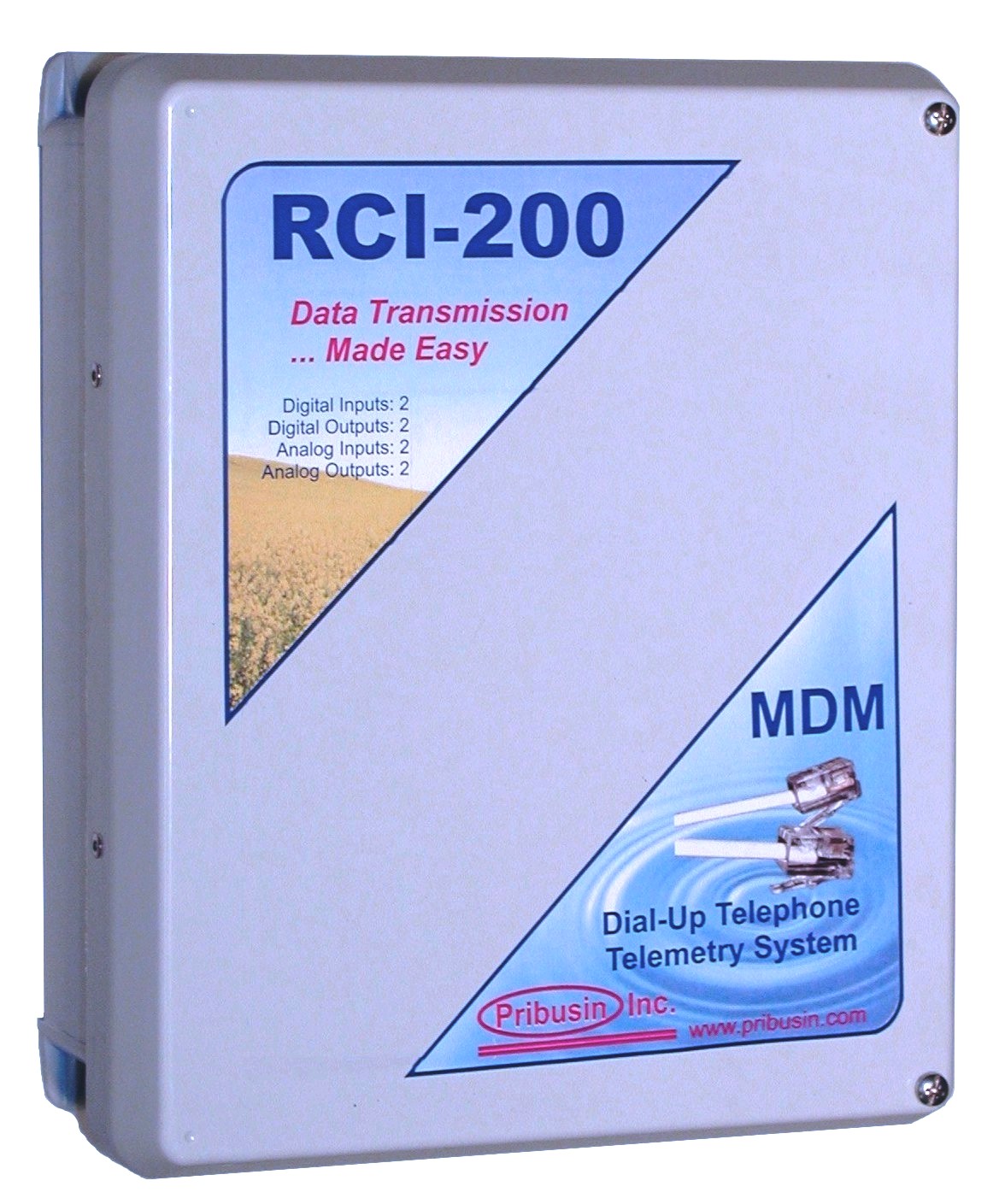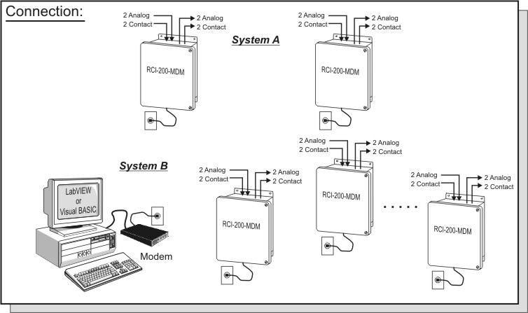 The RCI-200-MDM is a bi-directional dial-up communication system that exchanges the status of 2 dry contact inputs and 2 analog inputs between a host and remote unit or a PC equipped with a modem. A basic system consists of A) one host station and one or more remote station(s) OR B) several remote stations and one PC with a modem.