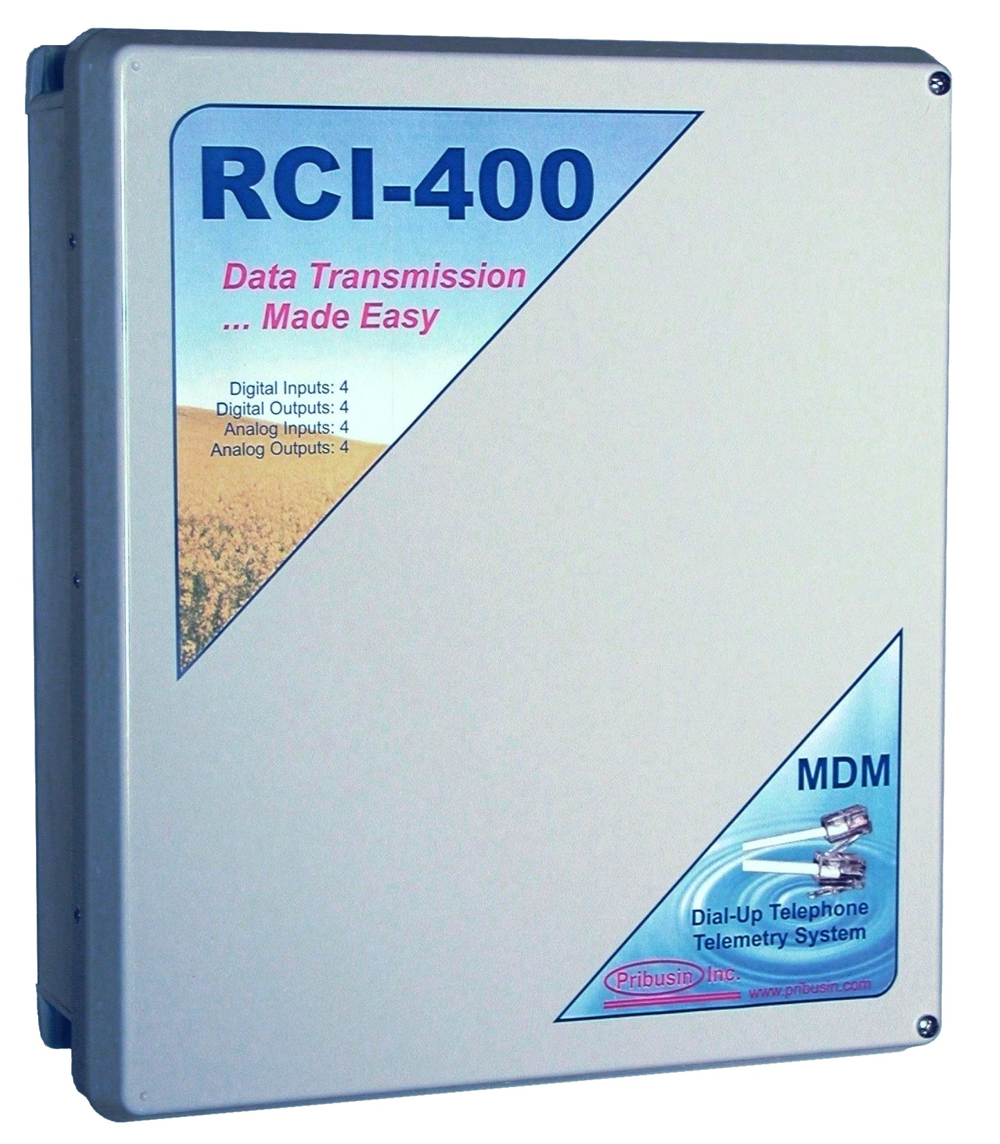 The RCI-400-MDM is a bi-directional remote communication system that exchanges the status of 4 dry contact inputs and 4 analog inputs between a master and remote unit or a PC equipped with a modem. A basic system consists of
