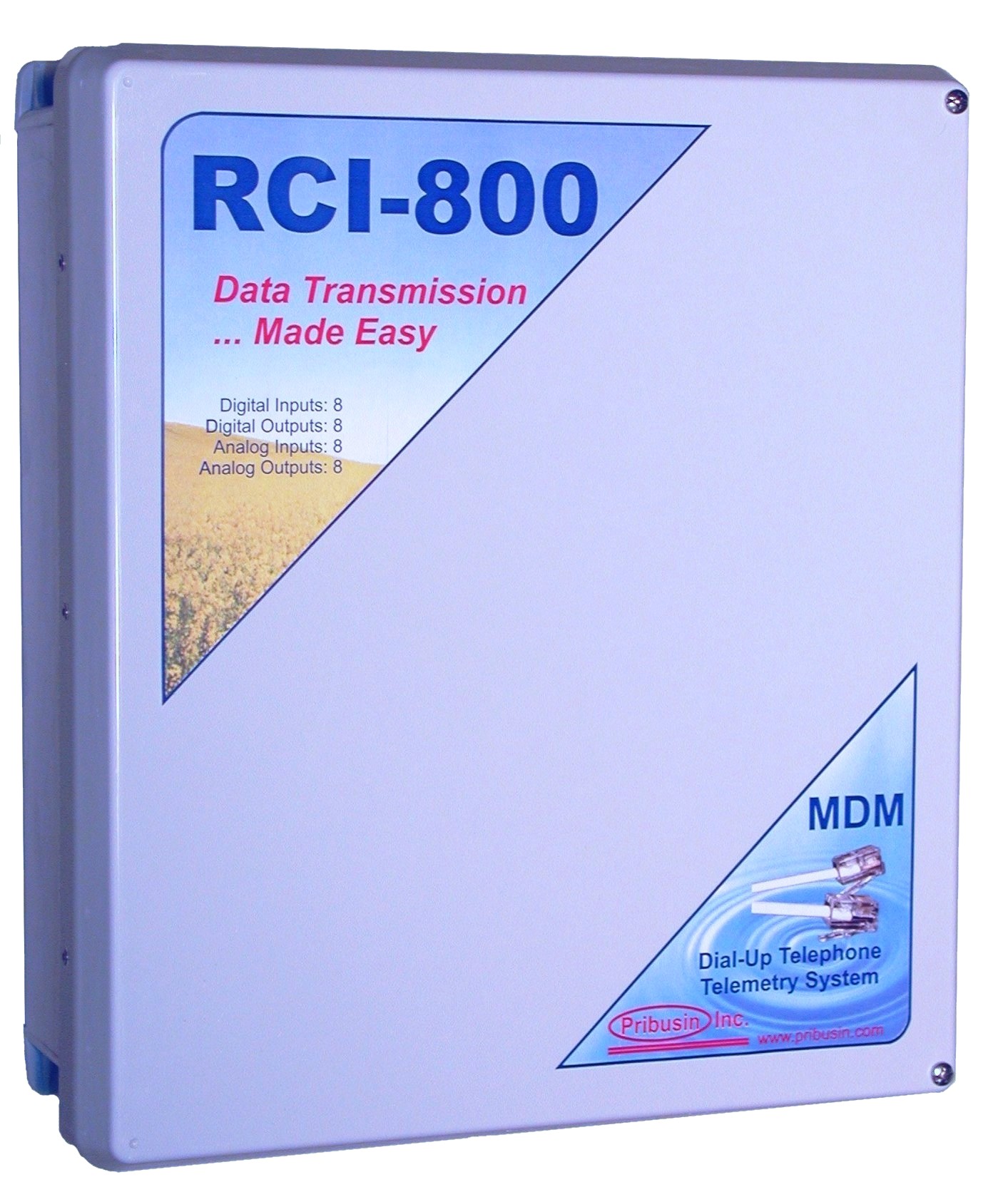 The RCI-800 is a bi-directional remote communication system that exchanges the status of 8 dry contact inputs and 8 analog inputs between a master and remote unit or a PC equipped with a modem. A basic system consists of